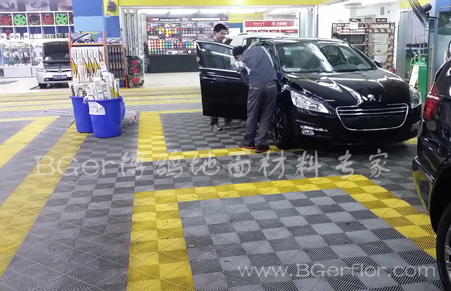 灰色和黃色洗車地面格柵搭配,整體鋪裝大面積汽車保養服務店地面,美觀,整潔,高檔。